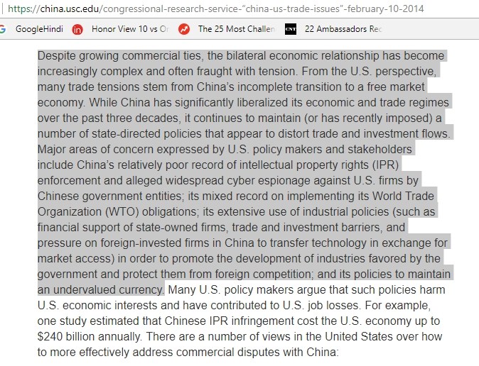 Alt News has stumbled upon a goldmine of plagiarised content on the website of premier right-wing think tank India Foundation. India Foundation is an independent research centre that seeks to put out a Indian nationalistic perspective on issues related to the Indian polity. Its stellar list of directors includes Suresh Prabhu, Nirmala Sitharaman, M.J. Akbar, Jayant Sinha, Swapan Dasgupta, Shaurya Doval and Ram Madhav, to name a few.It has equally impressive sounding publications like ‘US-China trade war and its impact on India’, ‘India & BRICS: Working together to usher in the second “Golden Decade” of BRICS cooperation’, ‘Security outlook of Indian Ocean and India’s Geo strategic interest in the IOR’, ‘Xi Jinping: President for Life’ and ‘Quadrilateral Partnership for Free and Open Indo-Pacific’. The five articles listed here have one thing in common other than their imposing titles – they are all plagiarised to varying degrees. The plagiarised content seems to originate from one author by the name of Siddharth Singh.We analyse the five articles to uncover the shocking extent of intellectual dishonesty where someone else’s words and ideas are passed off as that of the author.Case study 1: ‘US-China trade war and its impact on India’The article titled ‘US-China trade war and its impact on India’ is entirely a cut and paste from multiple sources. Every single paragraph of the article is copied verbatim from somewhere.The article starts by saying, “A trade war between the United States and China is brewing, any outbreak will have a major impact on the global political and economic order.” This sentence has been lifted verbatim from South China Morning Post’s opinion piece titled ‘US-China trade war offers Beijing a historic opportunity to forge a new global order’ written by Tian Feilong. As you read further, you realise that it is not the first sentence alone but the first paragraph is plagiarised from this article.The second paragraph is a lift off from a publication of the University of Southern California’s US-China institute.The author then moves to a publication by the Congressional Research Service on China-US trade issues and copies the next two paragraphs verbatim from there. As in the earlier paragraphs, there is no attribution or acknowledgment of the source.The WTO section has been copied from an article by the Spanish think tank, Elcano Royal Institute.When it comes to writing about the impact of the trade war on India, the author picks a source closer to home. The entire section on Impact on India has been copied from an Indian Express article by Anil Sasi.This article was removed by India Foundation when the plagiarism was pointed out by Twitter user Rupa Subramanya. The author also responded to Subramanya, claiming that it was an issue of missing footnotes.However, the issue is beyond just citing a reference as entire sections have been copied verbatim without putting them in quotes and attributing credit to the source. In fact, we found other articles by the same author on the India Foundation website that display a similar pattern.Case study 2: ‘India & BRICS: Working together to usher in the second “Golden Decade” of BRICS cooperation’This article too is copied from multiple sources. The article was tweeted by India Foundation on September 15, 2017. It represents a shameful level of plagiarism, copying words not only from an editorial but also from the speeches delivered at the BRICS summit without any attribution.One section is copied from a Times of India editorial titled ‘Xiamen breakthrough: Brics declaration condemns Pakistan based terror groups for first time’.Words from the Prime Minister Narendra Modi’s speech at the BRICS summit 2017 are reproduced in the article as that of the author.The conclusion of the article borrows heavily from Chinese President Xi Jinping’s speech at the plenary session of the BRICS Xiamen Summit.Case study 3: ‘Security outlook of Indian Ocean and India’s Geo strategic interest in the IOR’Among other sources, this article copies from an Australian Navy’s publication of 2014 – ‘Protecting the ability to trade in the Indian Ocean maritime economy’ which contains the proceedings of the Indian Ocean Naval Symposium.India Foundation should take note of the copyright notice that this publication carries and take necessary action as it not only reproduces parts of the article but attributes no standard source credit.“© Copyright Commonwealth of Australia 2014This work is copyright. Apart from any fair dealing for the purpose of study, research, criticism or review, as permitted under the Copyright Act 1968, and with the standard source credit included, no part may be reproduced without written permission. Enquiries should be addressed to the Director, Sea Power Centre – Australia”Words used in the conclusion are copied from an article by Colonel Sanjive Sokinda published by the Centre for Defence and Strategic Studies (CDSS), the educational institution of the Australian Defence College. Though the India Foundation article mentions references at the end, there is no mention of this article.Case study 4: ‘Xi Jinping: President for Life’Parts of an article on Xi Jinping titled ‘Xi Jinping – president for life’ tweeted by India Foundation on February 27, 2018 are lifted from The Guardian’s ‘Dictator for life’ published one day before, on February 26, 2018.Case Study 5: ‘Quadrilateral Partnership for Free and Open Indo-Pacific’This article was tweeted by India Foundation on February 6, 2018. Parts of this article are lifted from the White Paper on foreign policy for 2017 published by the government of Australia.Another excerpt is taken from a paper by the Observer Research Foundation written by Yogesh Joshi dated May 30, 2017.It is appalling that the high profile think tank which has Union ministers as directors and claims to be based on the p